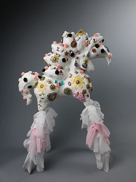 welded steel with epoxy clay adorned with Swarovski crystals and various mixed media